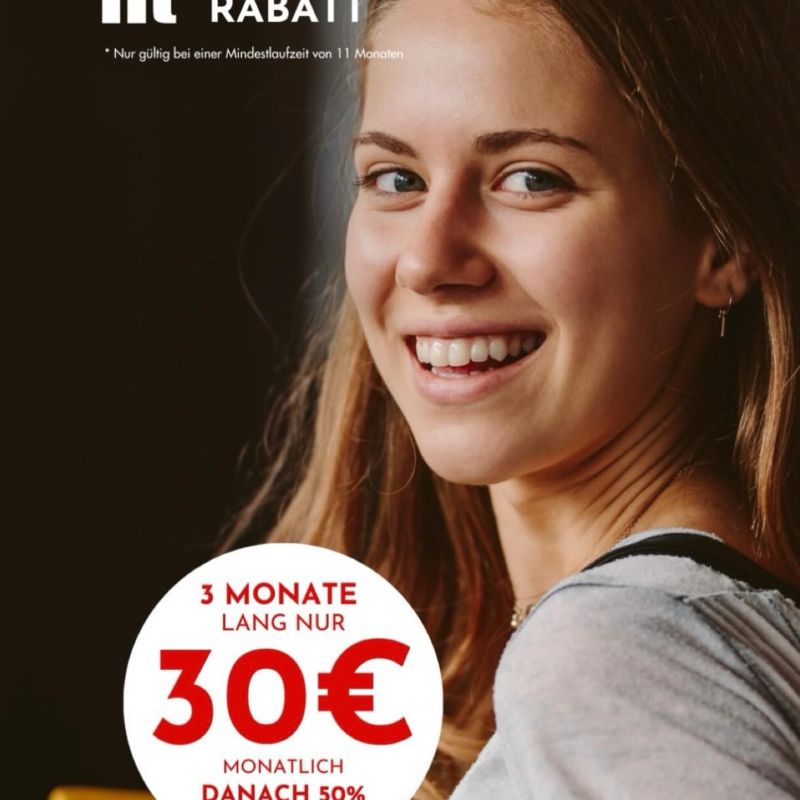 Ihr zahlt 3 Monate lang nur 30€ monatlich und bekommt anschließend 50% Rabatt!