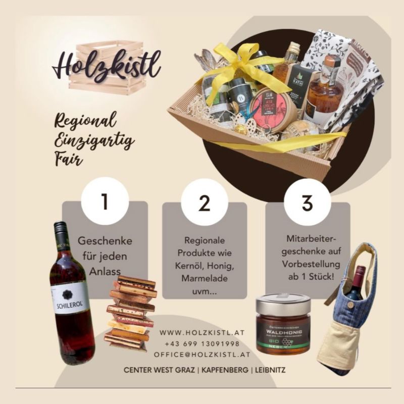 Ob für deine Liebsten, Geschäftspartner*innen oder Mitarbeiter*innen - im Holzkistl findest du besondere Geschenke voller regionaler Köstlichkeiten und Handwerkskunst.