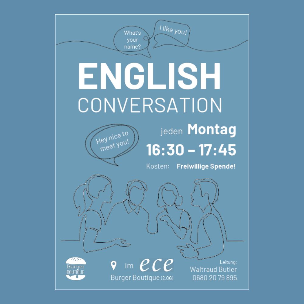 Wollt ihr euer Englisch verbessern? – Dann kommt gern jeden Montag von 16:30 – 17:45 Uhr in die Burger Boutique im 2.OG des ece vorbei und plaudert in netter Runde miteinander.
